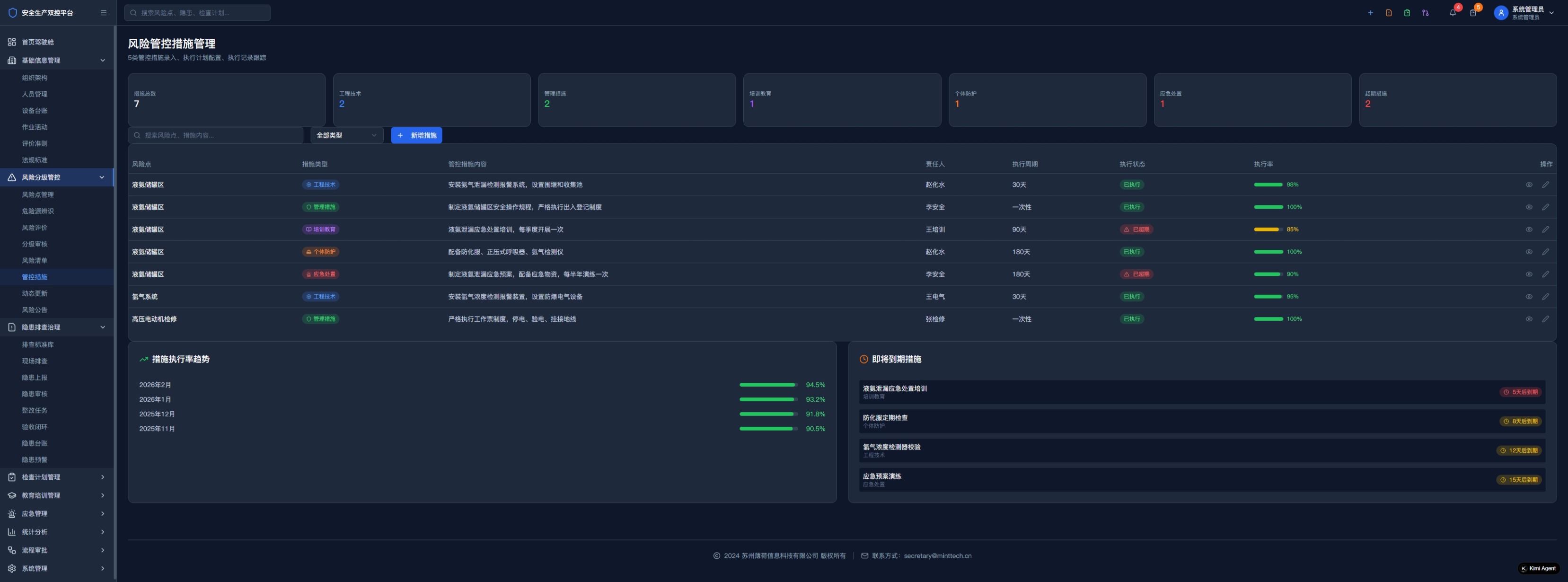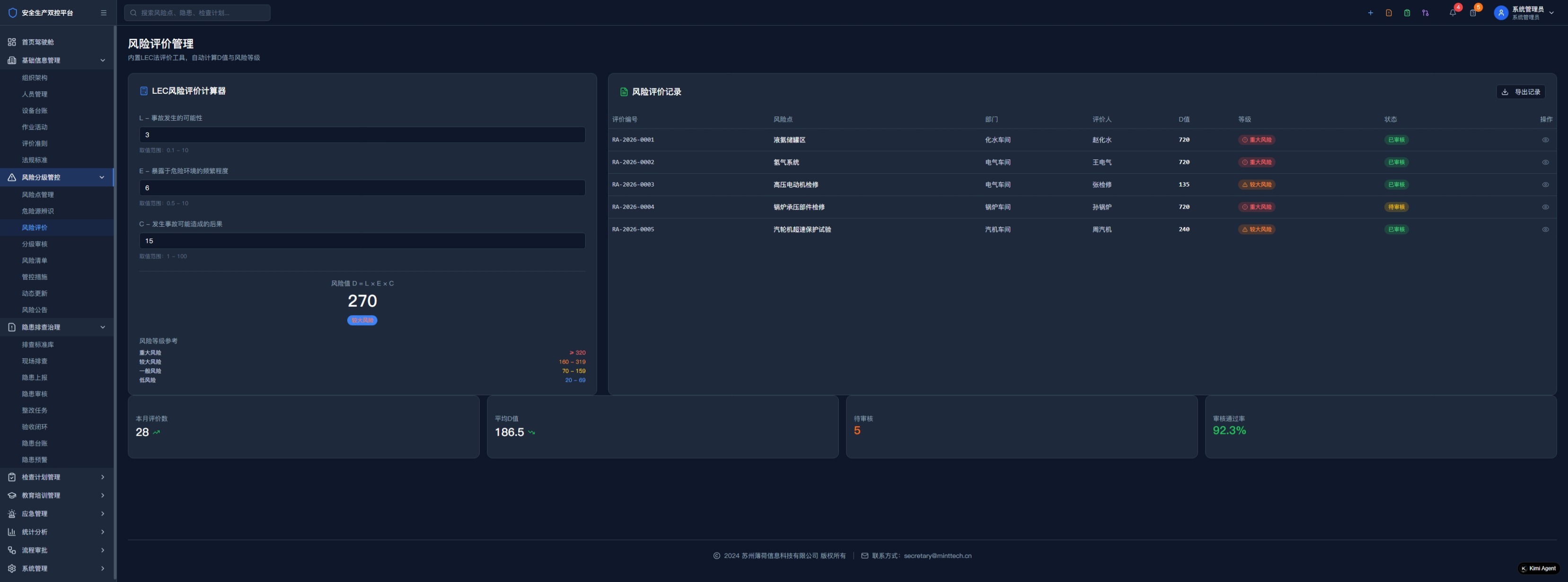 风险点智能辨识、危险源系统分析、风险评价动态分级、管控措施精准制定与执行跟踪,支持红橙黄蓝四色分级可视化管理