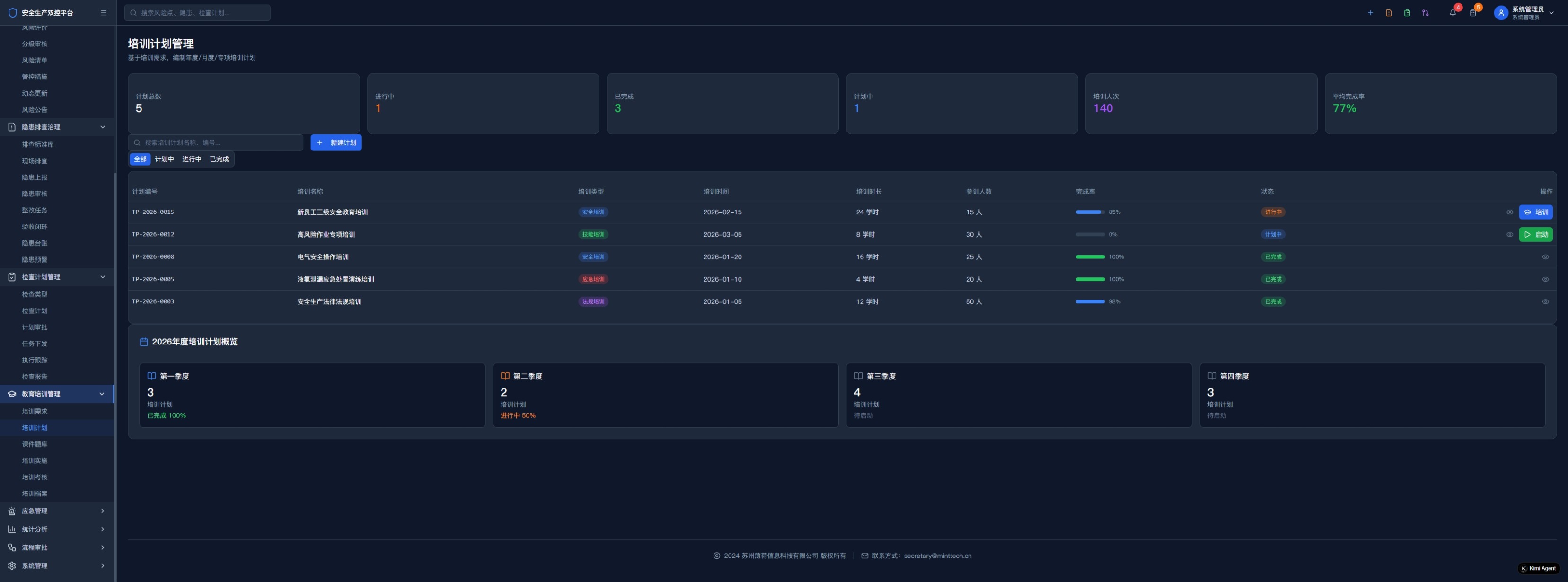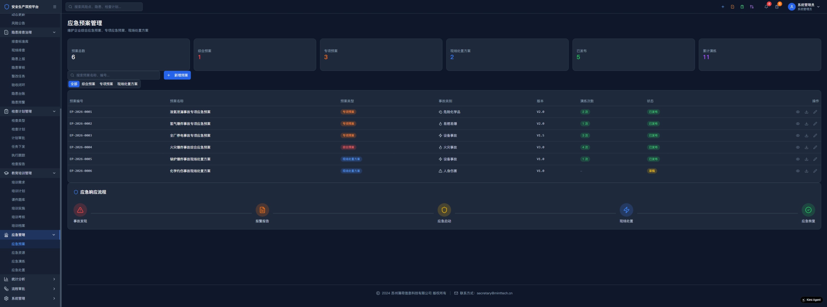 安全培训计划管理、在线考试系统、应急预案数字化管理、演练评估闭环、应急资源智能调度
