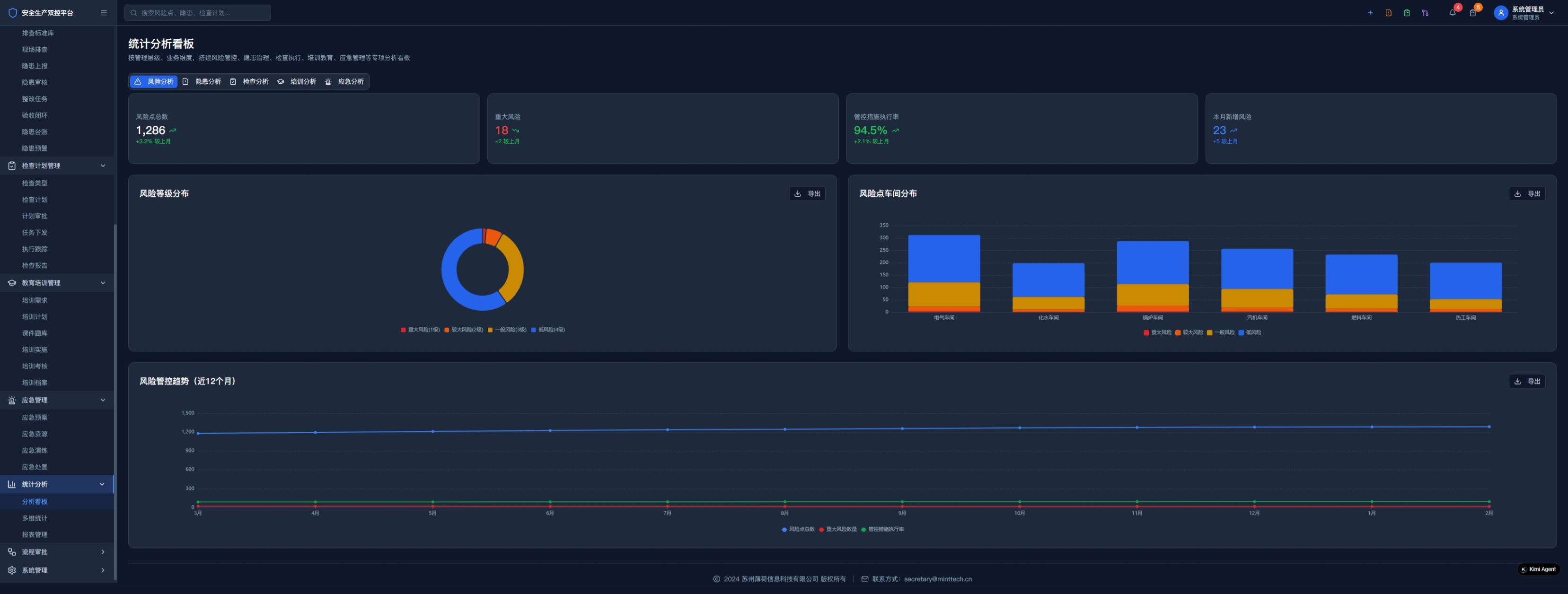 多维度安全数据统计、风险趋势智能分析、隐患治理效能评估、安全绩效可视化展示