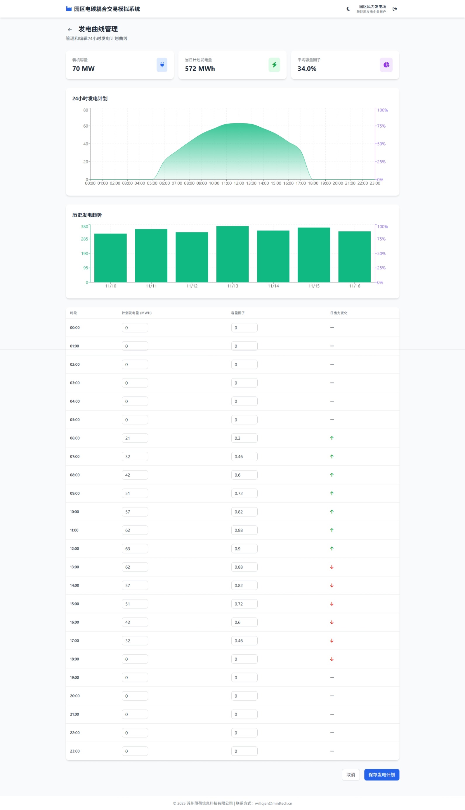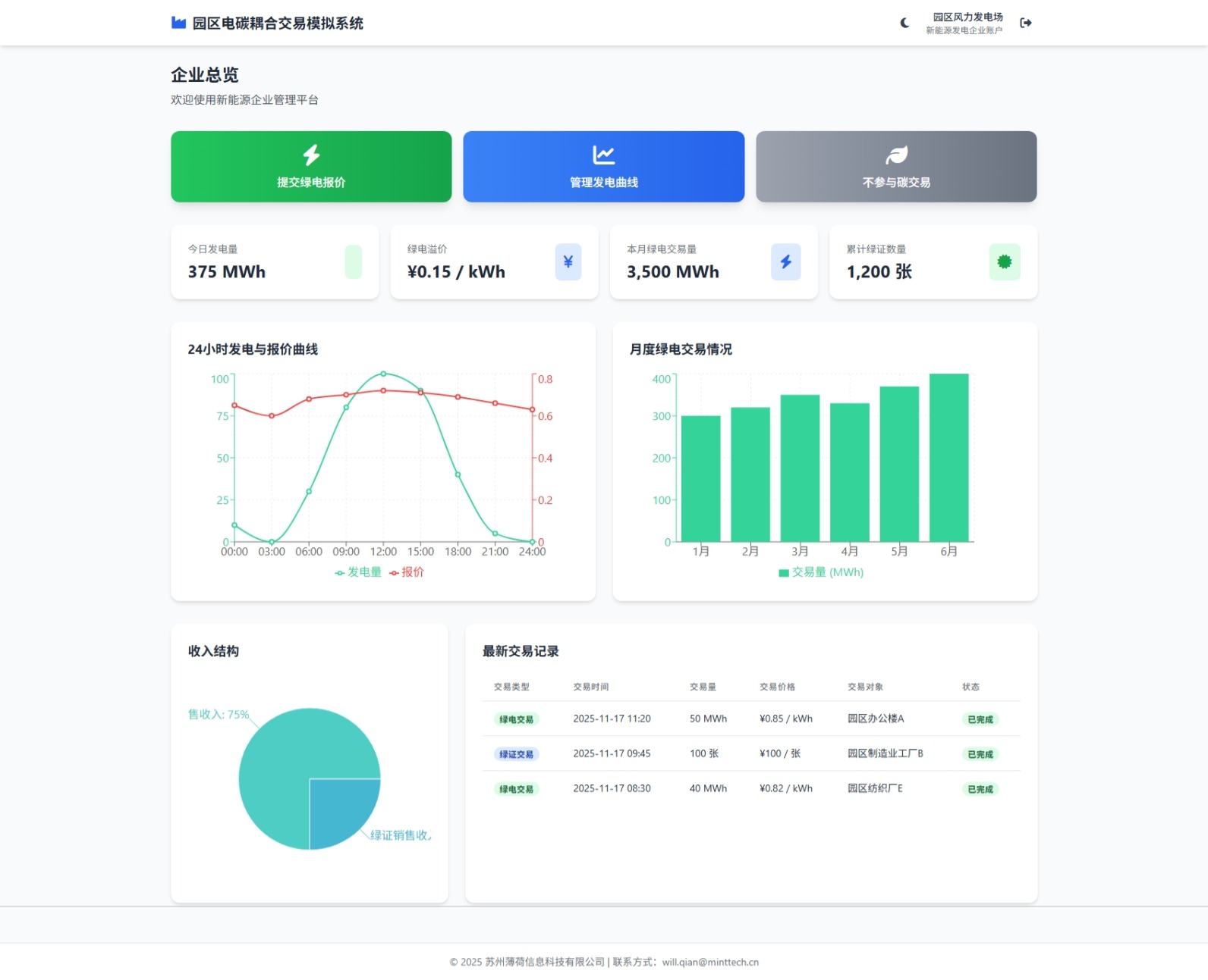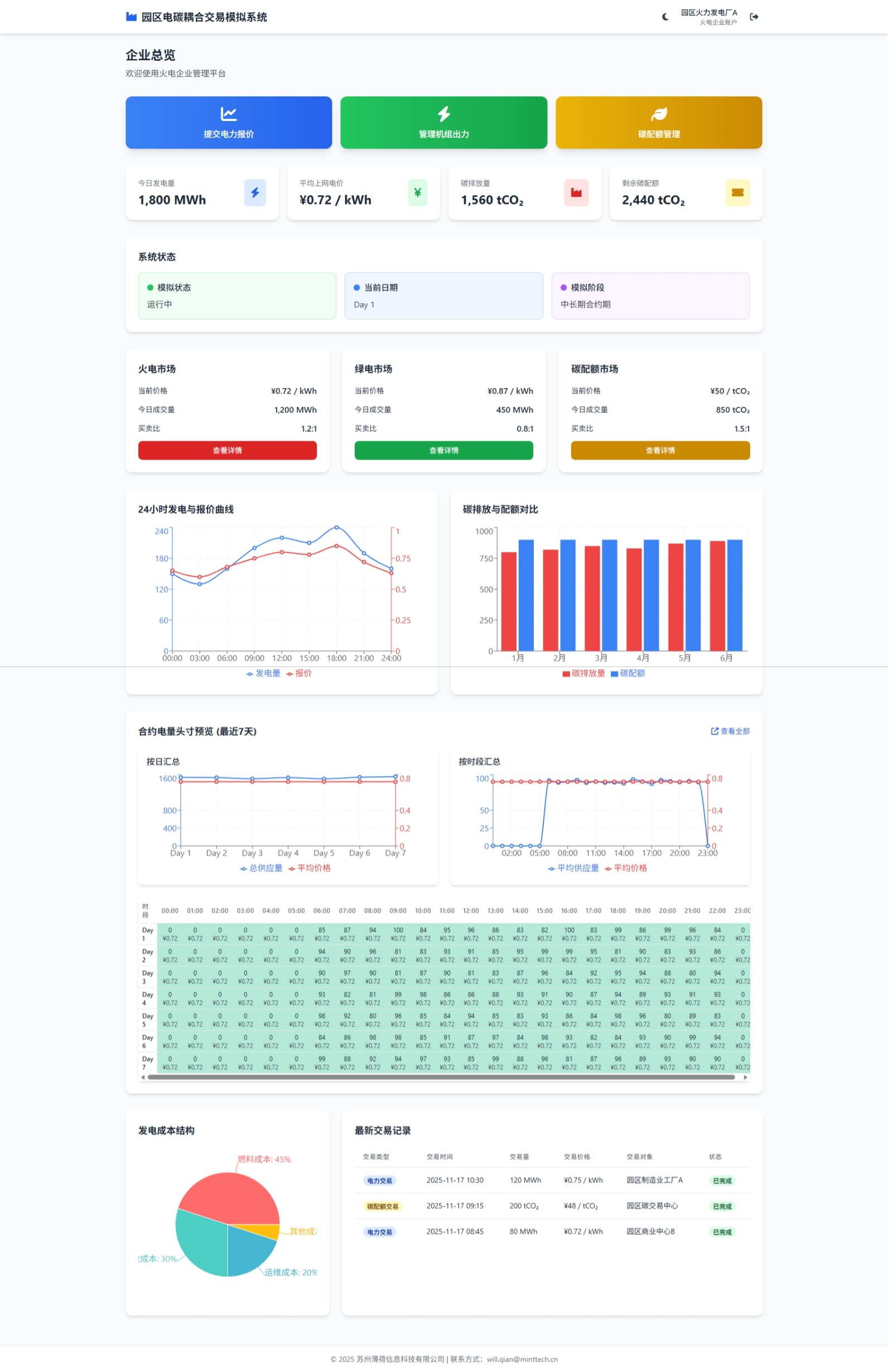 系统提供园区管理中心、发电企业、用电企业三类角色视角,集成参数设定、配额分配、电力报价、机组管理、碳配额交易、能源监控等核心功能模块。通过模拟运行,帮助企业理解电碳市场交易机制,优化交易策略,提升绿电消纳比例,降低碳排放成本,支撑园区低碳转型与双碳目标实现。
