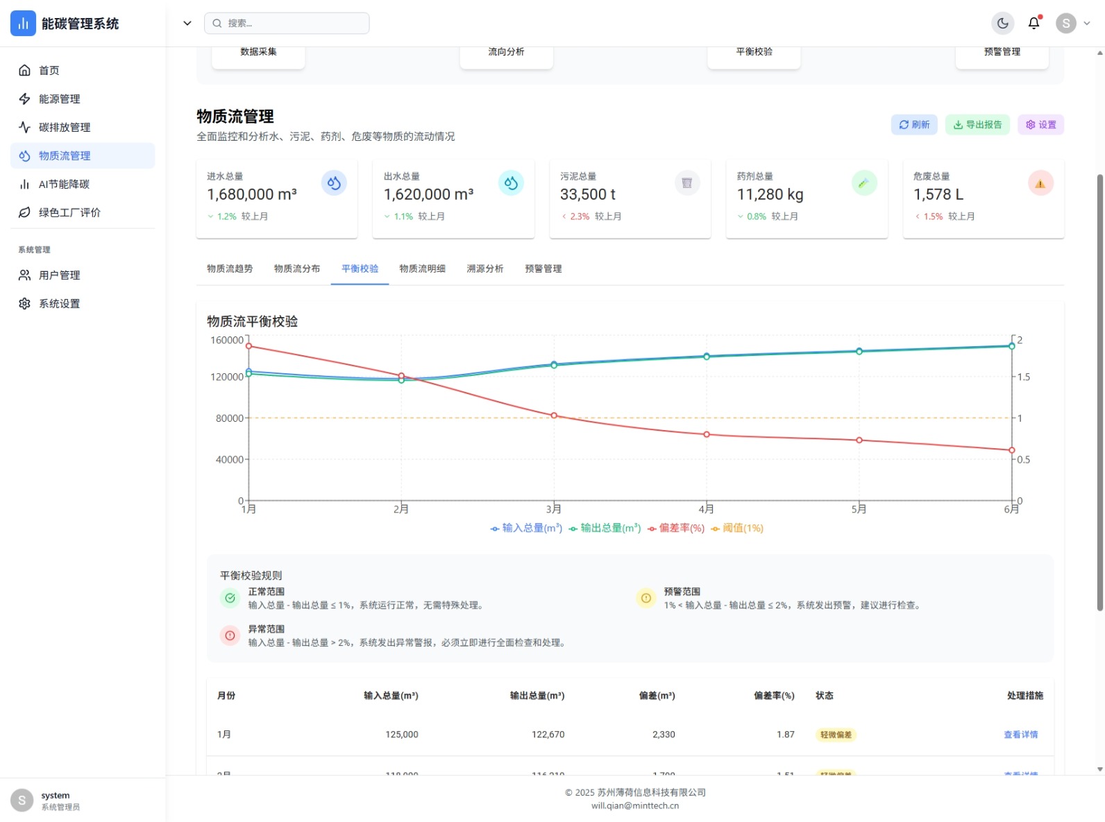 物质流趋势分析、平衡校验、预警管理,实时监控进水、出水、污泥、药剂、危废等物料流动