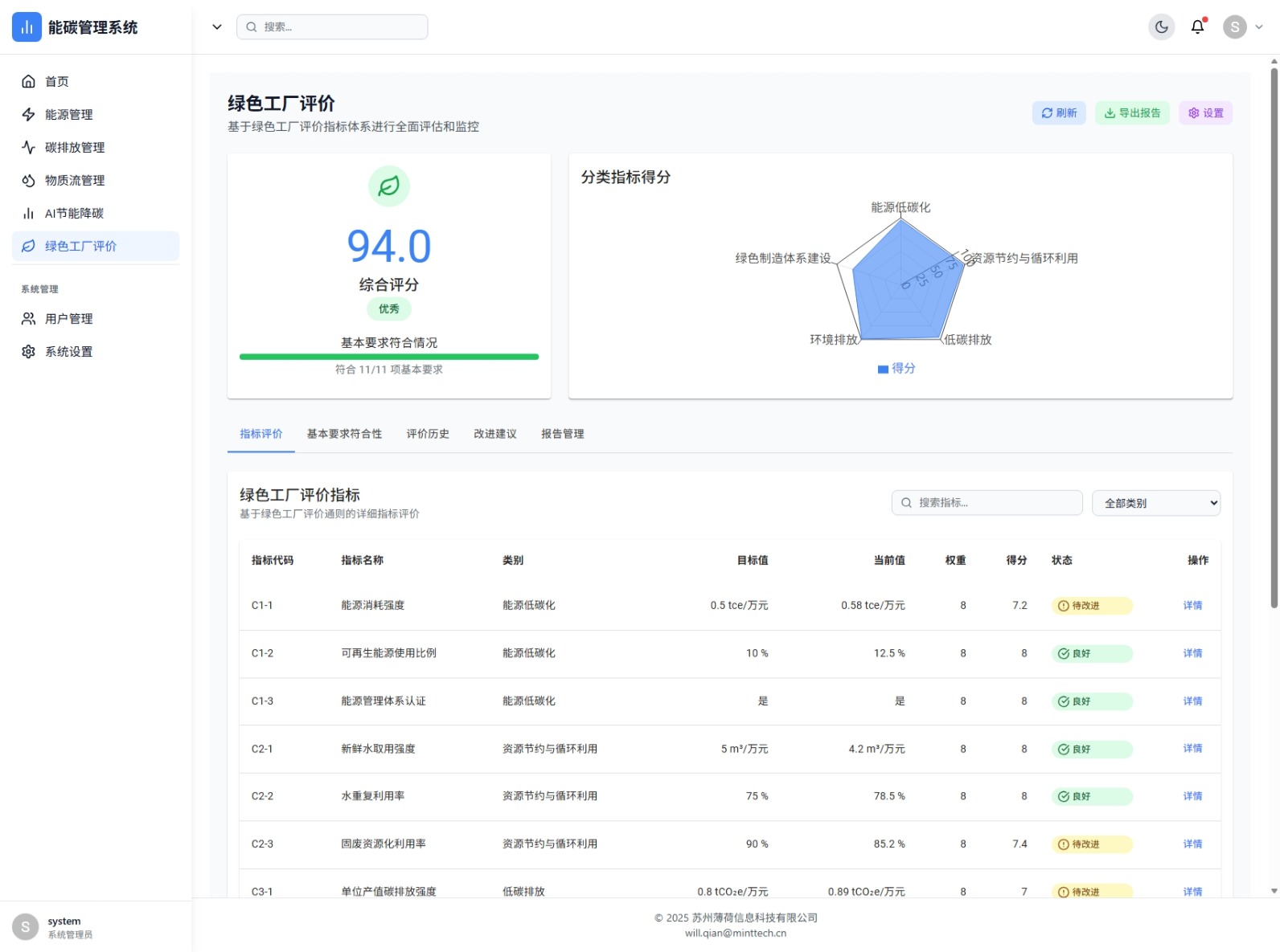 基于绿色工厂标准的企业自评系统,覆盖能源低碳化、资源节约与循环利用、低碳排放、环境排放等多维度指标评价